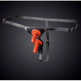 Страпон для двойного проникновения. В комплект входят два съёмных пластиковых плага для насадок (длина 68 мм). Изготовлен из натуральной кожи и никелированной фурнитуры. Размер универсальный. Цвет : черный.