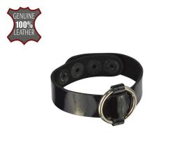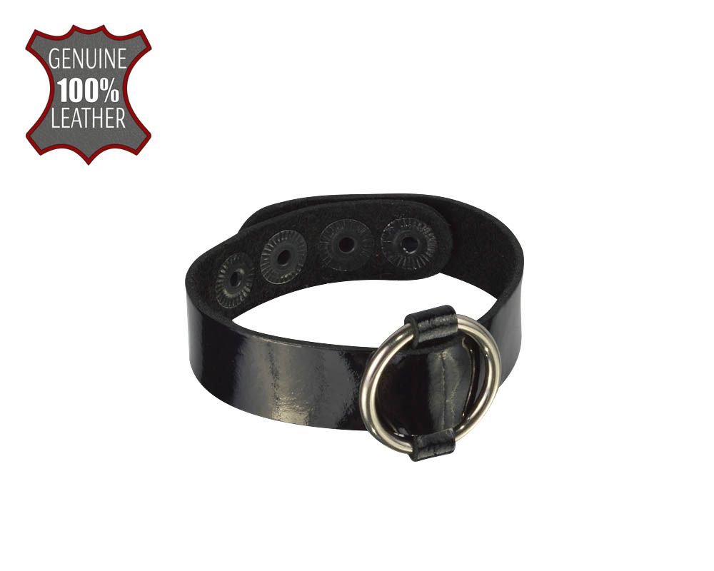 Браслет из натуральной лаковой кожи черного цвета украшен металлическим кольцом. Регулируется при помощи кнопок. Длина браслета 21 см, ширина 1,5 см. Металлическое кольцо имеет никелевое покрытие. Масса нетто 10 гр.Характеристики