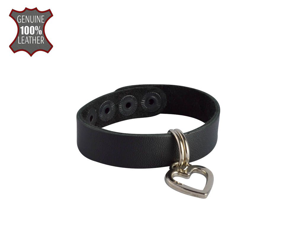 Браслет из натуральной кожи черного цвета, украшен подвесным металлическим сердечком. Регулируется при помощи кнопок. Длина браслета 21 см, ширина 1,5 см. Металлическое сердце имеет никелевое покрытие. Масса нетто 15 гр.