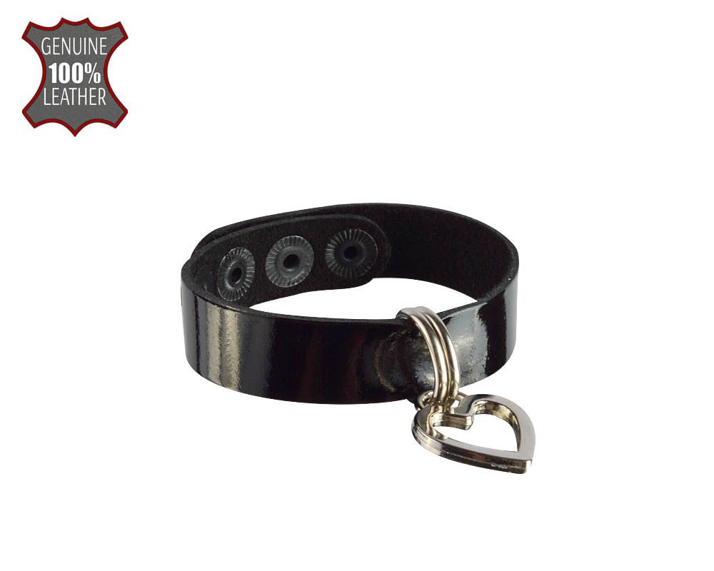 Браслет из натуральной лаковой кожи черного цвета, украшен подвесным металлическим сердечком. Регулируется при помощи кнопок. Длина браслета 21 см, ширина 1,5 см. Металлическое сердце имеет никелевое покрытие. Масса нетто 15 гр.