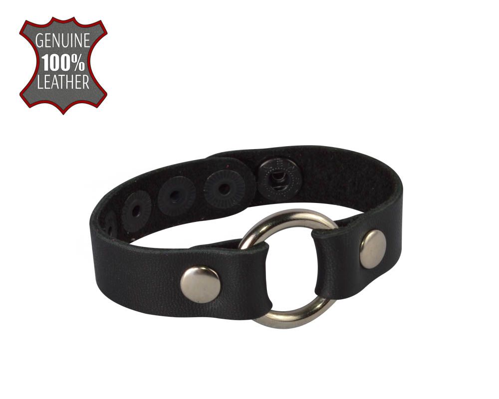 Браслет из натуральной кожи черного цвета, украшен металлическим кольцом. Регулируется при помощи кнопок. Длина браслета 21 см, ширина 1,5 см. Металлическое кольцо имеет никелевое покрытие. Масса нетто 15 гр.