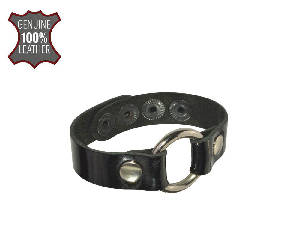 Браслет из натуральной кожи черного цвета, украшен металлическим кольцом. Регулируется при помощи кнопок. Длина браслета 21 см, ширина 1,5 см. Металлическая фурнитура имеет никелевое покрытие. Масса нетто 15 гр.
