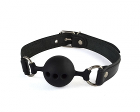Силиконовый кляп-шар с ремешками из натуральной кожи черного цвета. Вдоль ремешков проходит лаковая кожаная накладка черного цвета. Регулируется девайс при помощи металлической пряжки. Металлическая фурнитура имеет никелевое покрытие.Характеристики