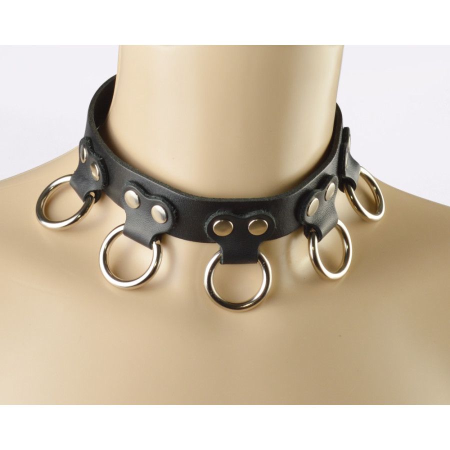Чокер изготовлен из натуральной кожи и декорирован пятью металлическими кольцами. Размер регулируется кнопками. Цвет черный.
