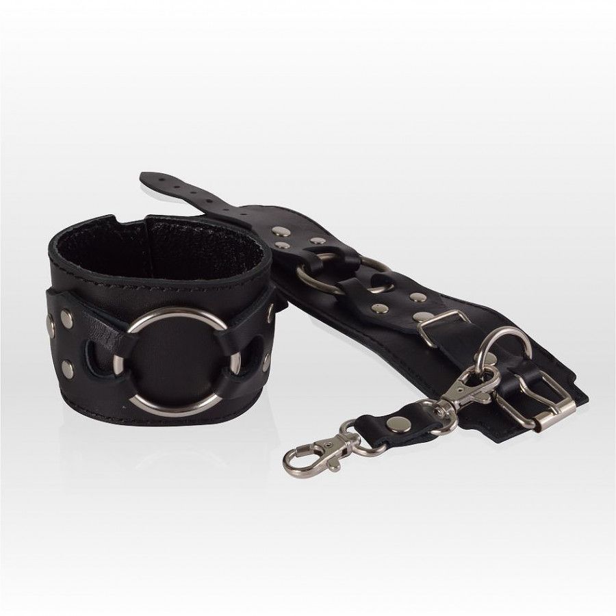 Черные наручники из натуральной кожи от Ситабелла помогут ограничить движения секс-партнёра, достаточно лишь одеть на запястья комфортный, но прочный девайс. Лаконичные, но при этом красивые наручники подойдут, как для женщин, так и для мужчин, т.к. размер легко регулируется при помощи металлической пряжки. Готические фигурные накладки, удерживающие большое металлическое кольцо, придают наручникам агрессивной сексуальности и роскоши. Соединяются наручники при помощи небольших карабинов, скреплённых кожаной перемычкой. Вся металлическая фурнитура имеет никелевое покрытие.Общая длина около 27 см
