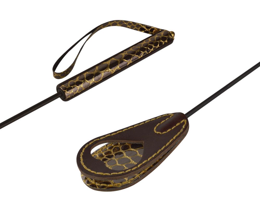 Стек состоит из жесткой рукояти, длиной 15 см, гибкого полимерного хлыста и каплеобразной хлопушки из натуральной кожи с яркими декоративными вставками "Рептилия", длиной 12 см. Общая длина стека 65 см.