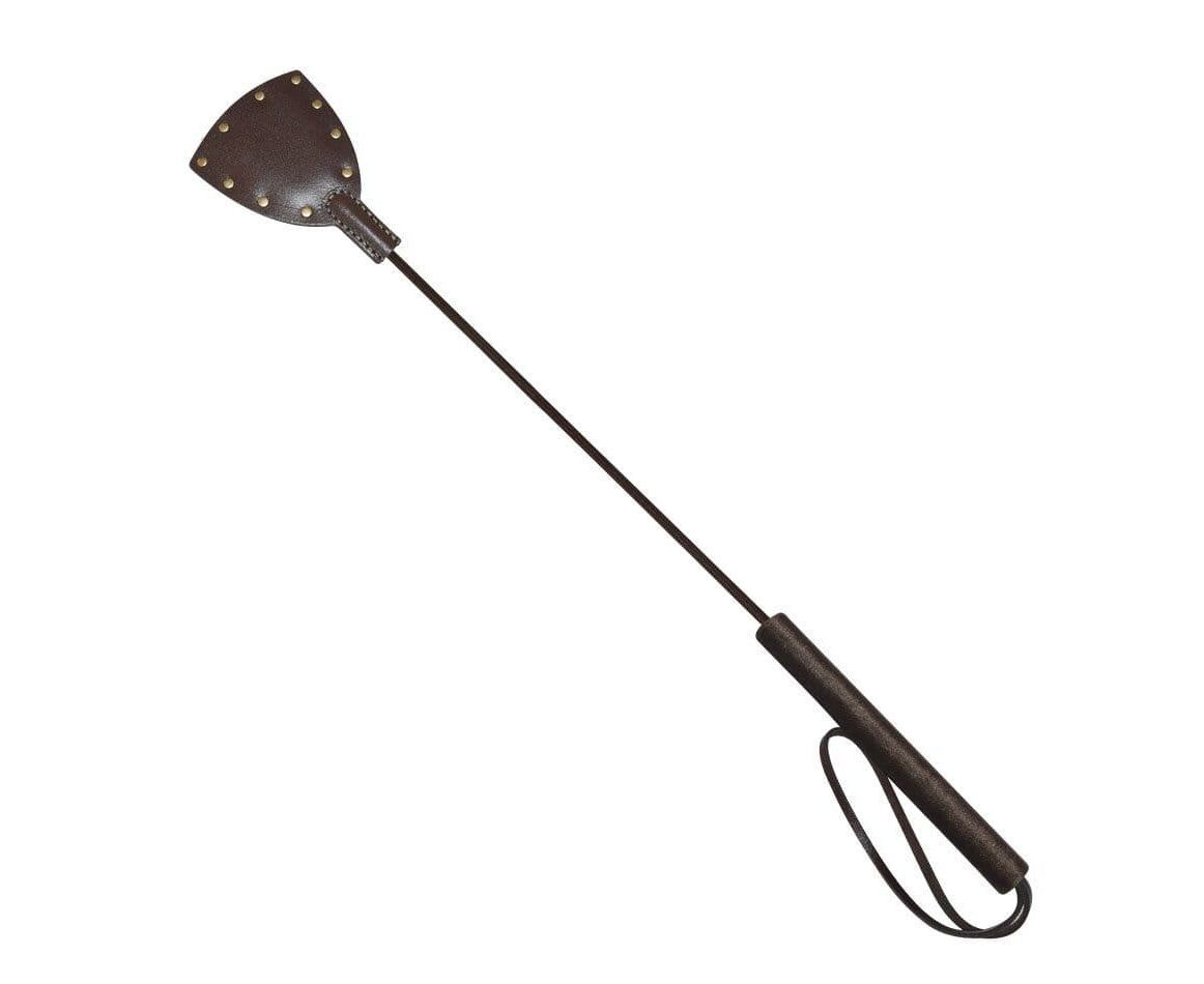 Стек Готика представлен в виде роскошного, изящного изделия цвета темного шоколада. Основательная хлопушка стека изготовлена из натуральной кожи высокого качества и украшена большим количеством клёпок. Хлопушку и рукоять соединяет упругий, но прочный хлыст. Комфортное использование девайса обеспечивает бархатистая рукоять, покрытая велюровой тканью. Ремешок-петля, находящийся на рукояти, позволяет дополнительно фиксировать стек на запястье. Длина рукояти - 17 см. Длина хлопушки - 15 см.