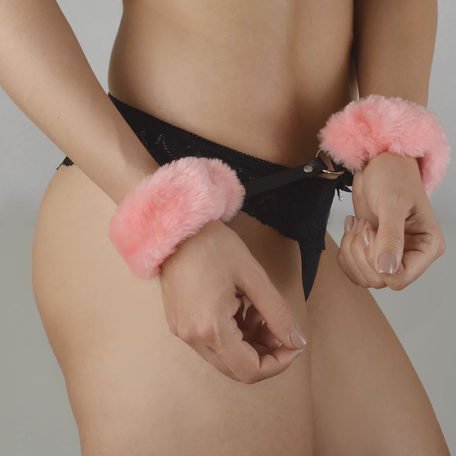 Ремешки наручников изготовлены из натуральной кожи и декорированы съемным искусственным нежно розового мехом.