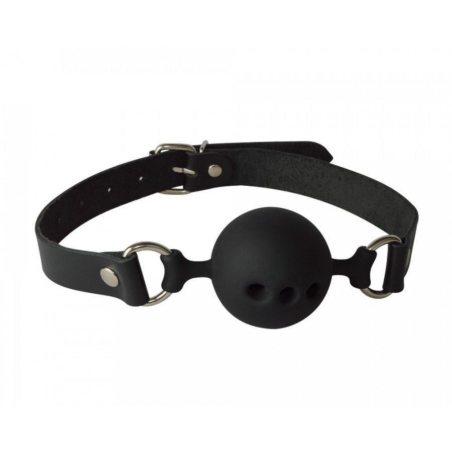 Кляп-шар изготовлен из силикона, диаметр 45 мм. Сфера имеет три сквозных отверстия. Ремешки выполнены из натуральной кожи. Кляп регулируется при помощи пряжки.