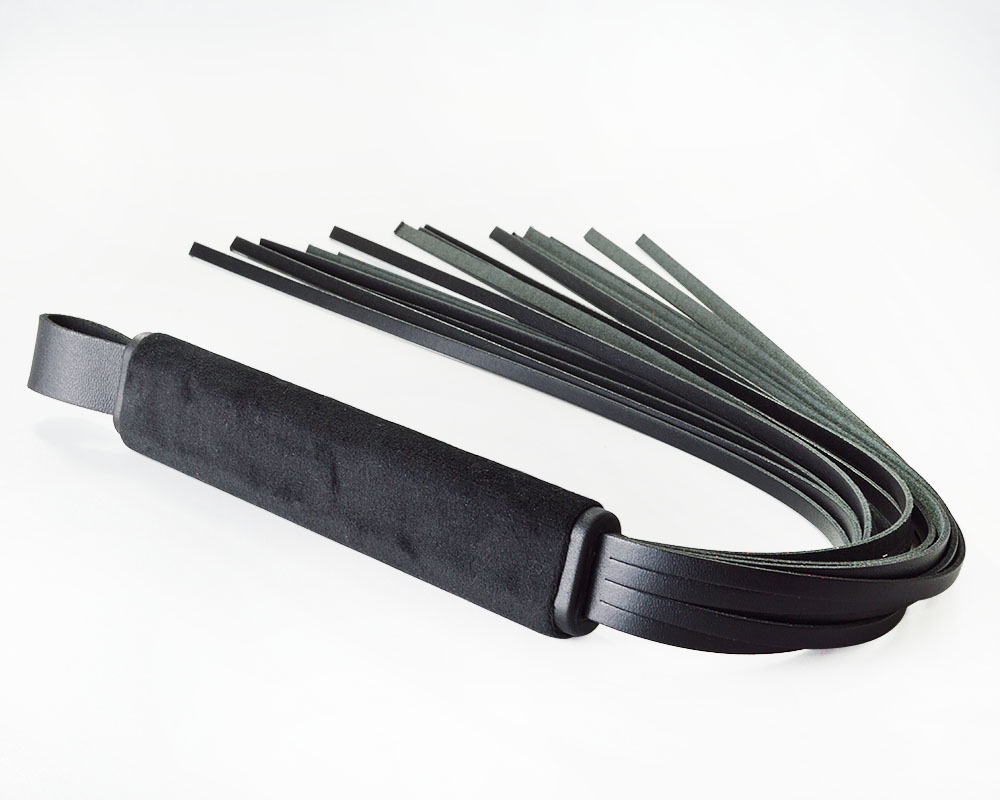 Рукоять плети обтянута велюровой тканью. Хвосты изготовлены из натуральной велюровой кожи черного цвета.