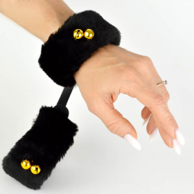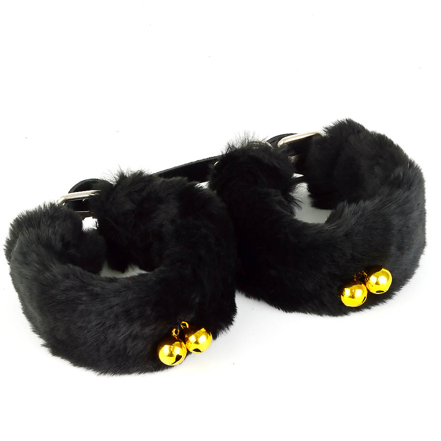 Ремешки наручников изготовлены из натуральной кожи и декорированы съемным искусственным мехом глубокого черного цвета и золотистыми, звонкими бубенчиками.
