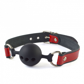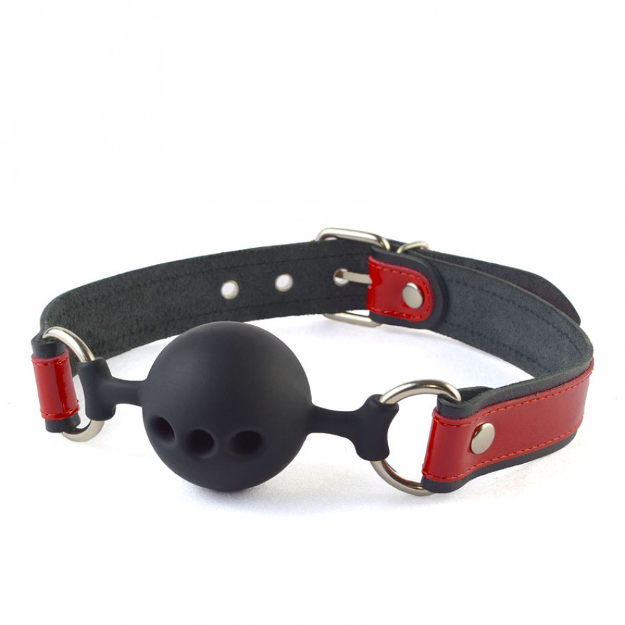 Силиконовый кляп-шар с ремешками из натуральной кожи черного цвета. Вдоль ремешков проходит лаковая кожаная накладка красного цвета. Регулируется девайс при помощи металлической пряжки. Металлическая фурнитура имеет никелевое покрытие