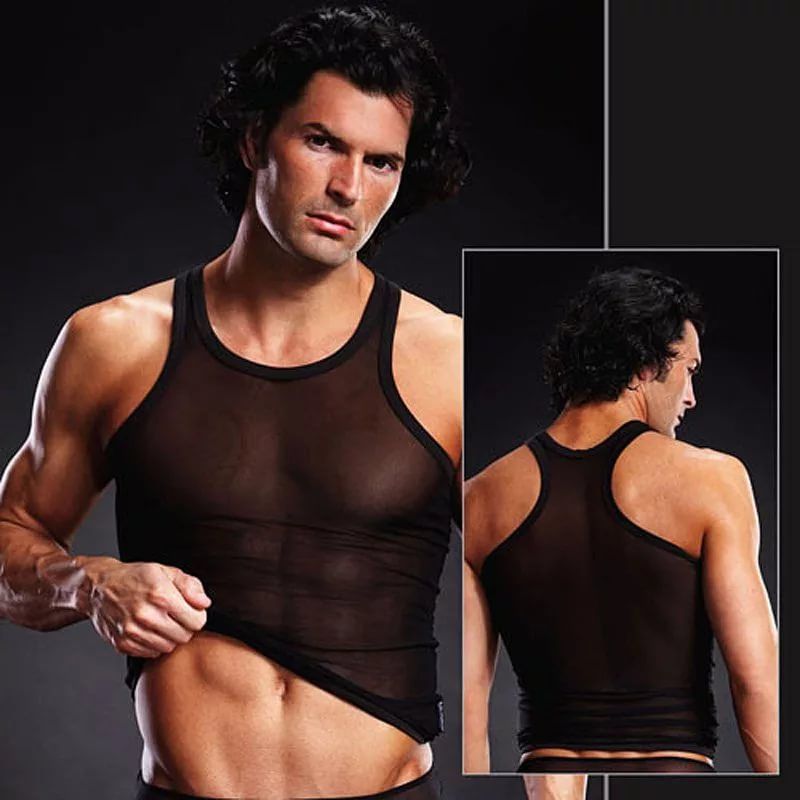 Мужская майка из тонкой сетки с открытыми плечами. Борцовка зрительно делает плечи шире. Майка облегающего покроя.