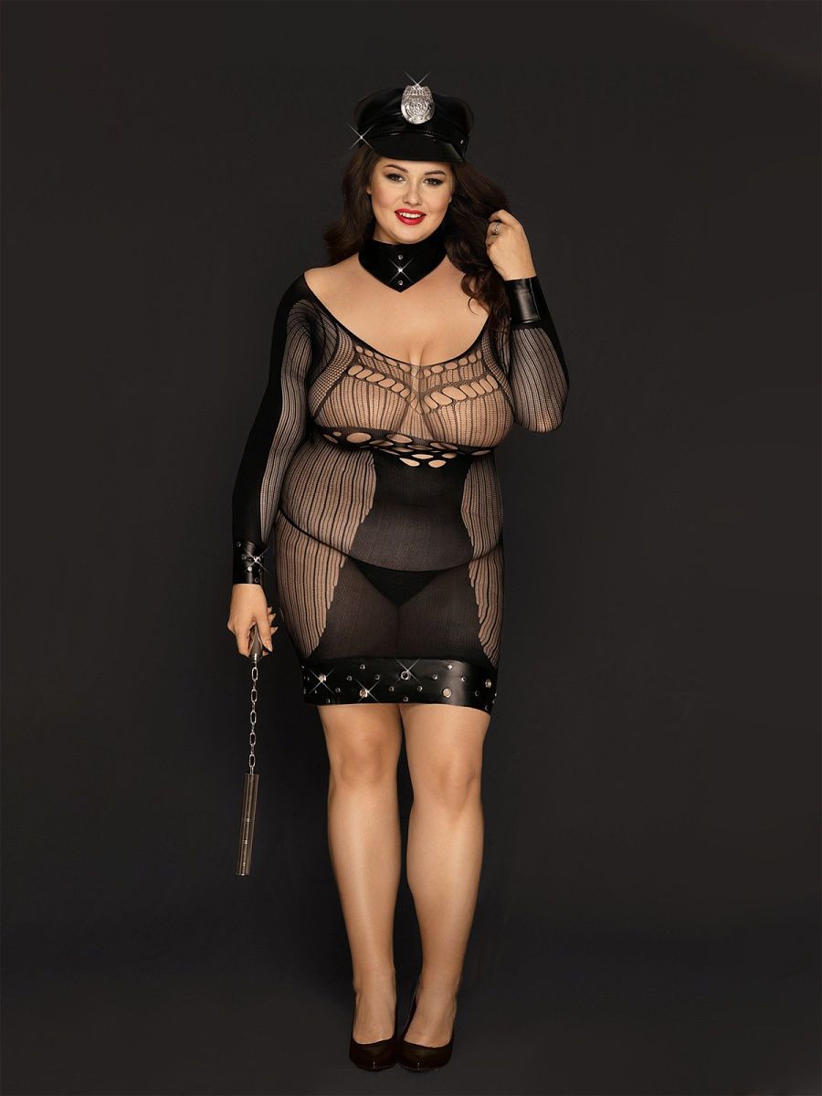 Этот эротический костюм полицейского размера плюс сайз - выбор смелых девушек! Любите игры и острые ощущения? Женский ролевой костюм полицейского вам понравится! Соблазнительный пеньюар сетка в сочетании с латексом сделает послушным и кротким вашего мужчину. Это эротическое белье для полненьких станет любимым бельем для соблазнения. В комплект эротик входит: сексуальное платье с трусиками, воротник, фуражка и нунчаки. Тонкий эластичный материал игрового костюма полицейской слегка облегает тело. Эротическое платье чулок сядет точно по фигуре, мелкая сетка едва скроет тело, придав эротическому костюму для ролевых игр еще больше соблазнительности. Дополняют сексуальное белье для полненьких латексная фуражка с эмблемой, воротник, нунчаки с металлическим блеском, придавая эротическому комплекту дерзости. Побалуйте себя новинкой! Купите эротический костюм для ролевых игр по выгодной цене!