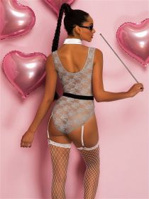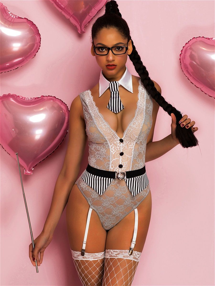 Восхитительный эротический костюм учительницы состоит из семи необходимых предметов: ремень, красивое боди, галстук, очки, чулки сетки, указка и корсет. Серый набор дополнен бело-черной контрастной отделкой. Боди для ролевых игр из этого сексуального костюма учительницы красиво подчеркивает талию и грудь, приоткрывая также спину. Указка и очки завершают соблазнительный женский костюм учительницы для ролевых игр. Это прекрасное решение для соблазнения, в таком наборе вы неизменно будете притягивать взгляд любимого мужчины. Девушка, выбравшая такой необычный сексуальный набор, излучает особую притягательность и привлекательность, яркое обаяние и женственность. В подобном наряде вы будете уверены в своих чарах силах и полностью осознаете свою неотразимость. Купите костюм учительницы для ролевых игр для получения небывалого удовольствия и восторга.