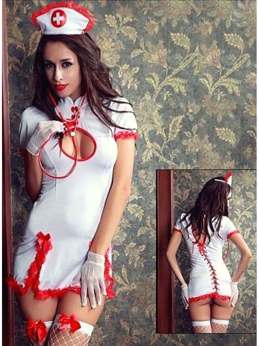 Костюм состоит из: платья с вырезом на груди и швом по всей спине, чулок в сетку, белыхперчаток, головного убора, трусики.Красный стетоскоп удачно дополняет этот убедительный образ.Каждый аксессуар безумно соблазнителен сам по себе, а все вместе они производят потрясающий эффект, обещая обоим партнерам запредельное удовольствие в постельных утехах.