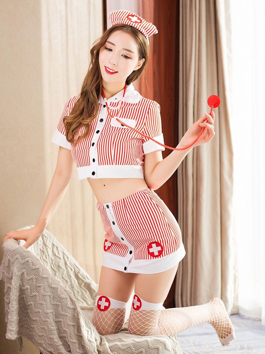 Ролевой костюм медсестры в розовую полосочку. Комплект: топ, головной убор, чулки, юбка, трусики, стетоскоп.