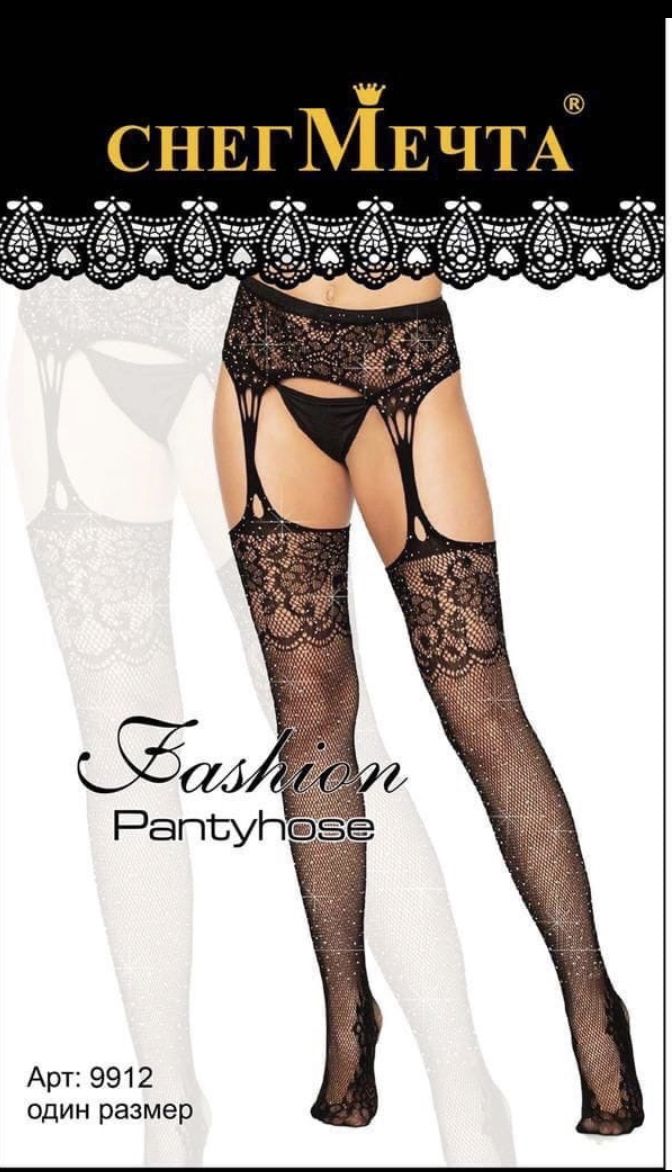Чулки с поясом мелкая сетка черные украшены стразами один размер