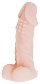Насадка на пенис анатомической формы с мошонкой. Очень эластичный, мягкий, приятный на ощупь материал. Длина: 15 см. Внутренняя длина: 14,5 см. Диаметр: 4 см. Внутренний диаметр: 2 см. Цвет: Телесный.
