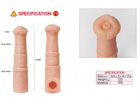 Насадка очень эластичная, имеет интересную необычную форму головку и поперечные бороздки по всей поверхности, для стимуляции эрогенных зон партнера, увеличивает толщину головки и ствола пениса. Специальное круглое отверстие у основания позволяет надежно фиксировать насадку на члене без лишних усилий.