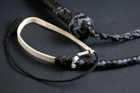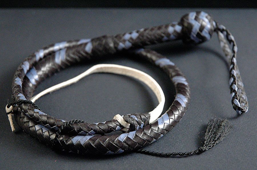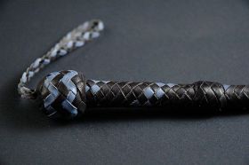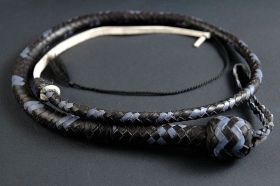 Миниатюрная копия настоящего снейка; гибкая кожаная плетеная ручка, переходящая в кнутовище на конус (600 мм.), с ограничительными бобышками для руки в виде плетеного шарика с петелькой для подвеса и цилиндра – (12-ти полосное 2-ое плетение: вначале «алмазное» затем переходящее в "ёлочкой") - с кожаным фалом (170 мм;120мм) из 6х2-2 мм. квадратного конусного шнура ременной кожи с закрепленным на конце "крекером" (180 мм).