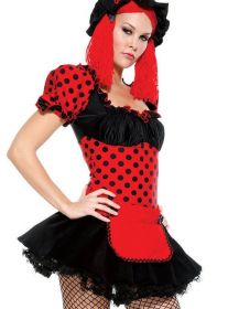 Этот сексуальный костюм состоит из четырех частей, особенности костюма это красное платье в горошек, красный парик, чепчик и фартук.