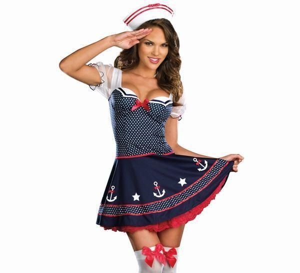 Костюм девушки морячки состоит из синего платья, юбка которого украшена якорьками и звёздочкам, на синем топе в мелкий горох имеется красный бантик и ажурные белые рукава, также имеется белая морская шляпка с красными полосками.Надев этот костюм в день моряка, вы сделаете правильный выбор. Подобрав к наряду красивые чулочки и обувь, вы завершите свой образ милой морячки.