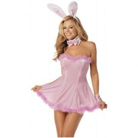 Костюм Драгоценного розового кролика представляет собой комплект из 5 предметов, который включает в себя эластичный бархат и блестящее платье с отделкой из перьев Марбу на шнуровке сзади, а также ушки, галстук-бабочку, манжеты на запястьях и хвост.